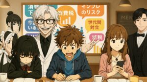 食品消費税ゼロは救世主か悪魔か?インフレ時代の究極の選択 2026年衆院選で自民・維新が食品消費税ゼロを公約化。家計には嬉しいが、長期金利上昇・円安・資産価格高騰の中でインフレリスクは?禍怨祟研究所のキャラクターたちが、短期的救済と長期的安定のジレンマを議論。消費税減税の光と影を中学生にもわかりやすく解説。 国内経済2026.01.19