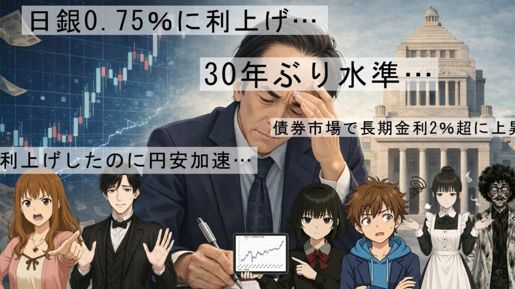 日銀による政策金利0.75%への利上げで30年ぶりの高水準!なのに円安が止まらない理由を超基礎から解説 日銀が政策金利を0.75%へ利上げ決定。30年ぶりの水準なのに円安が進む矛盾を、禍怨祟研究所のメンバーが金利の仕組みから徹底解説! 国内経済2025.12.21
