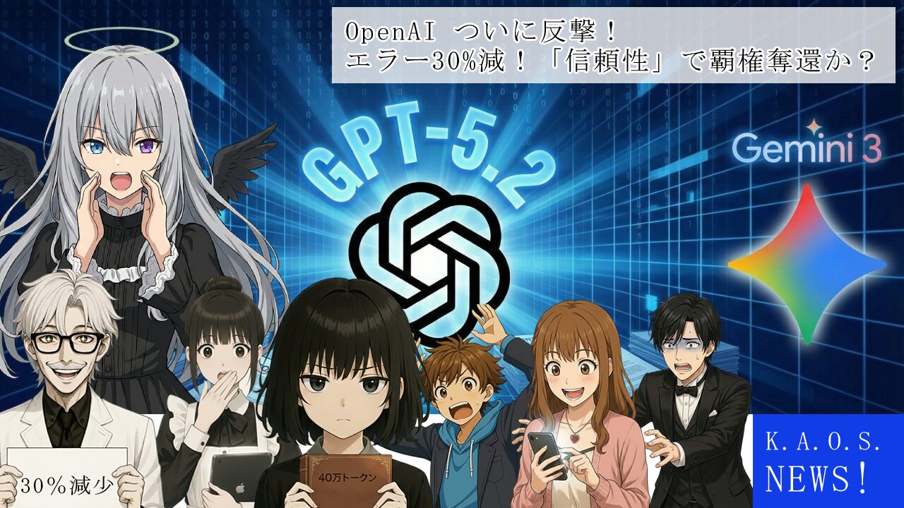 「コードレッド」宣言から約1週間。Google Gemini 3への反撃として、OpenAIがGPT-5.2をリリースしました。しかし今回の進化は「派手さ」ではなく「地味な信頼性の向上」。間違いが約30%減少、長文処理能力が飛躍的に向上、そして44の職種で人間の専門家を上回る性能――